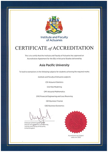 APU's Bachelor of Science (Honours) in Actuarial Studies including the two specialisms are fully accredited by the Institute and Faculty of Actuaries (UK).